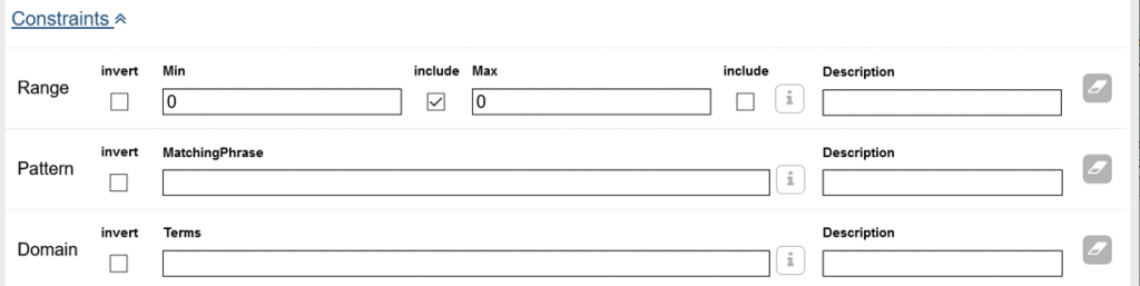 Range: If the input data is of numeric type, this constraint checks whether the input value falls in the specified range. If the input data is of type string, the range check behaves like a length check, which means the length of the input string should fall in the range. The range has a lower bound and an upper bound, plus two indicators to show whether the boundary values are included in the range. Negate function checks if the value is out of the range!